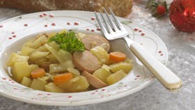 Skær medisteren i skiver og svits karry og løg i olien i et par min. Tilsæt hvidkålen sammen med gulerødder, kartofler og æbler. Hæld bouillonen ved og lad det småkoge under låg i 15 min. Tilsæt medisterstykkerne og lad det simre i yderligere 5 min. Smag til med salt og peber og server med et stykke groft brød.