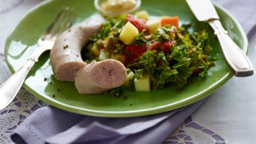 Rip grønkålen af stokken og skær den i strimler. Skræl kartofler og gulerødder og skær dem i tern. Hæld grønsagerne i et ovnfast fad sammen med løg, timian, salt og peber. Hæld bouillon og de flåede tomater over. Læg medisteren over grønsagerne og stil fadet i ovnen ved 200° i 35 min. Server med sennep og syltede rødbeder.