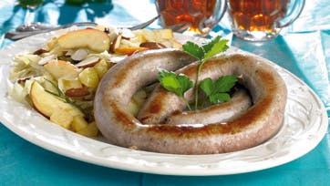 Brun skrællede kartofler i store tern i smør og 1 spsk. olie. Tag dem op og drys med salt. Kom løg og skyllet, afvandet kål ved. Kom knuste enebær, rosmarin og til sidst vin og eddike ved, læg låg på og lad småsnurre i 20 min. Kom så kartofler ved og efter 10 min. æbler og mandler. Mens kålen snurrer, steges den kogte medister på panden i det sidste olie. Den er kogt igennem, så den skal bare brunes på overfladen. Smag kålen til og server med lidt bredbladet persille og den stegte medister.