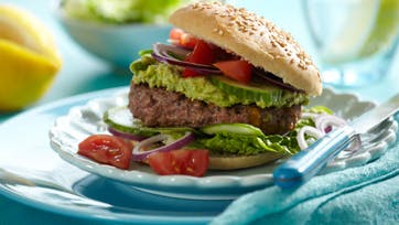 Bland kødet med revet ost og finthakkede, syltede jalapenos og form det til 4 bøffer. Flæk avocadoerne på langs og fjern stenene. Skrab avokadokødet ud med en ske og mos det godt med limesaften. Tilsæt hvidløg, salt og peber og smag guacamolen til. Steg bøfferne i olien ved jævn varme 3 min. på hver side. Skær tomat, agurk og rødløg i skiver og snit salaten fint. Flæk de lune burgerboller og læg dem sammen med ketchup, salat, bøffer, tomat, agurk, rødløg og guacamole og servér.