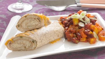 Rør fiskefarsen med finthakkede jalapenos og fordel den på de 3 tortillas. Rul tortillaerne sammen, læg dem i et ovnfast fad og drys med ost. Bag tortillaerne ved 180° varmluft i 20 min., til farsen har sat sig, og osten er gylden. Hæld væden fra bønnerne og skyl dem godt. Skær peberfrugter og gulerødder i små tern og forårsløgene i skiver. Bland bønnerne med grønsagerne, vend salsaen i og server.