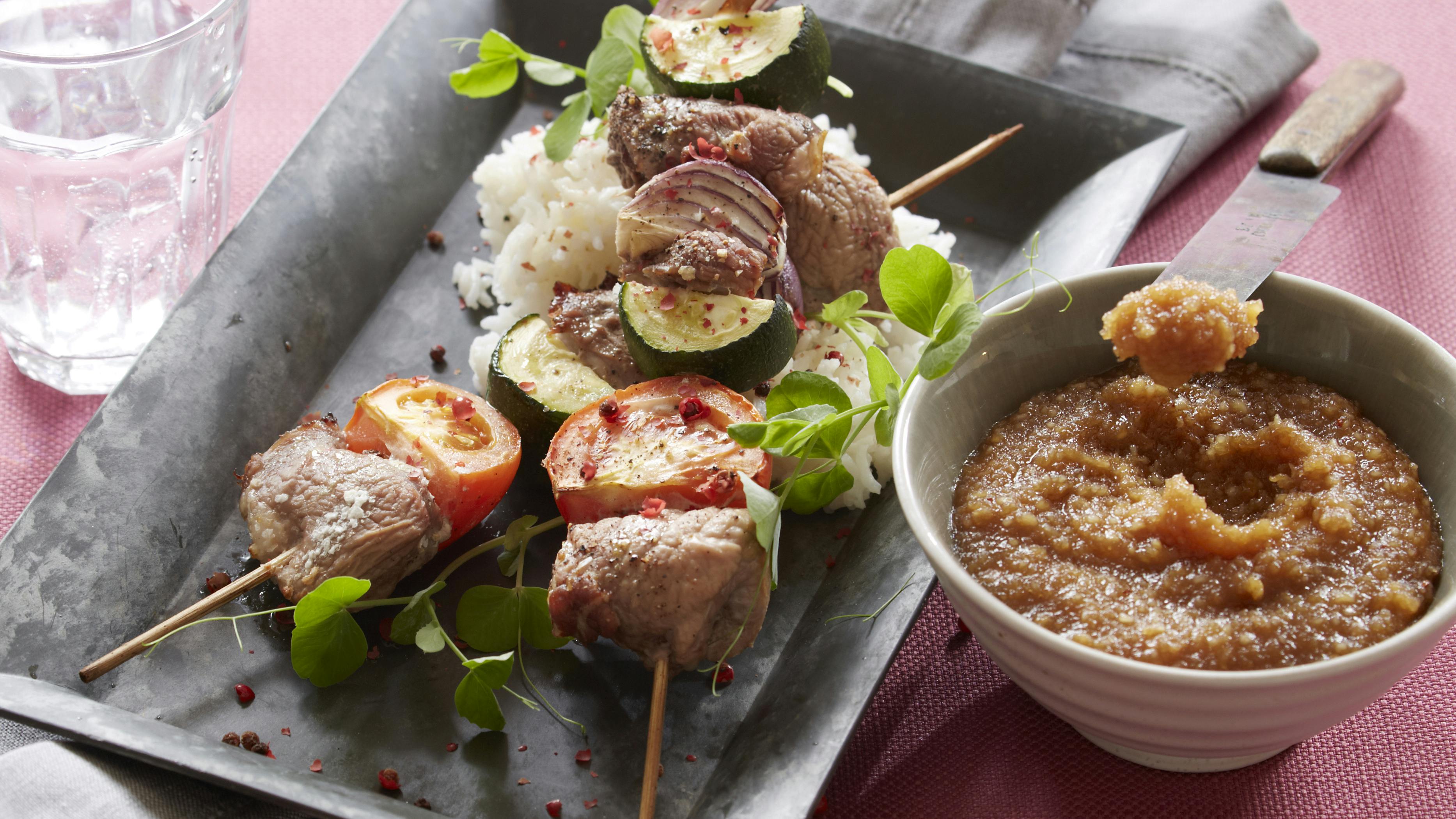 Skær den rensede courgette, tomater og løg i både og sæt dem på spid skiftevis med kødet.