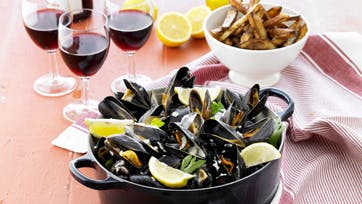 Skyl muslinger og skrub dem. Kasser dem, der ikke lukker sig eller er lukkede fra start. Hæld olie i en stor gryde, sauter løg og hvidløg og kom muslinger ved. Læg låg på og ryst gryden. Hæld vin ved og lad det dampe i 5 min., til alle muslinger har åbnet sig. Kog fløden lidt ind, til den er tyk, hæld den ved, drys med salt, peber og hakket persille og server med varme fritter og en relish af hakkede tomater, løg, krydderier og hakket persille.