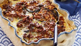 Læg auberginer og kød lagvis i et smurt, ovnfast fad. Sæt det i ovnen ca. 30 min. ved 200°.