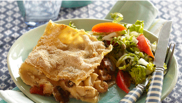 Skær filéten i mindre stykker og bland dem med rejer, dild, revet skal og saft fra citronen, salt og peber. Skær champignonerne i skiver og tomaterne i tern. Rist champignonerne i smørret, tilsæt tomaterne og krydr med salt og peber. Kom bechamelsovs, lasagneplader, fisk og champignon-tomat lagvist i et ovnfast fad og afslut med bechamelsovs. Drys lasagnen med rasp, bag den 45 min. ved 200° og servér med grøn salat og brød.