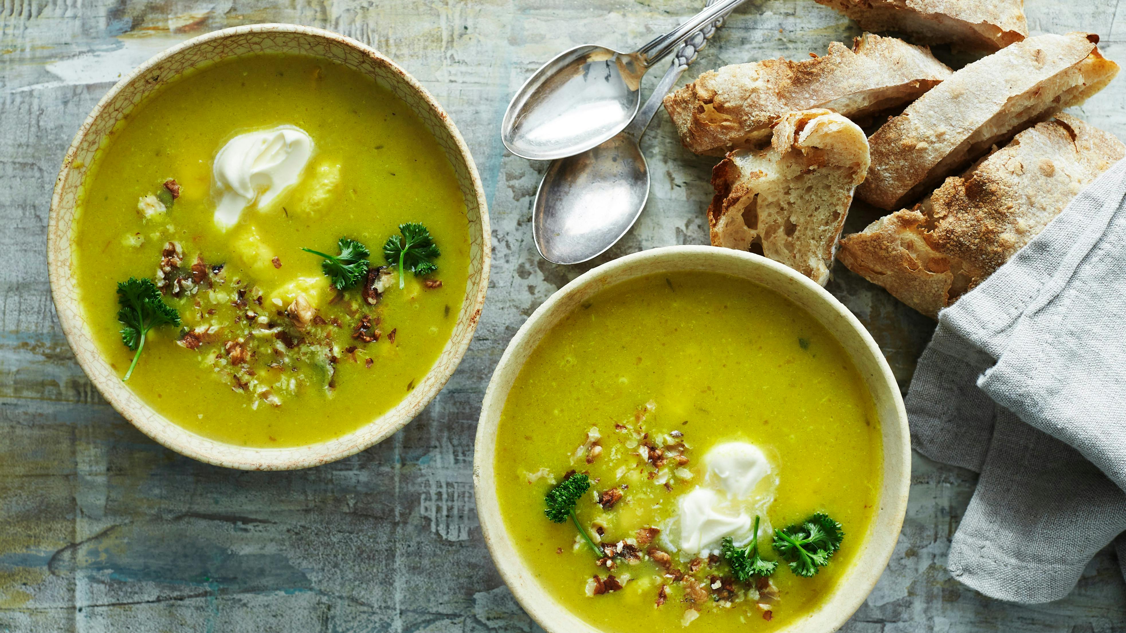 Servering: Hak valnødderne groft, og drys dem over suppen ved servering sammen med grofthakket kruspersille og en god skefuld cremefraiche. Spis lunet flute til.