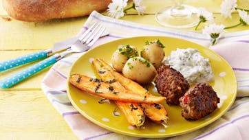 Bag gulerødderne i ovnen ved 200° i 25 min. Form farsen til små frikadeller og steg dem i olien ved middelhøj varme.