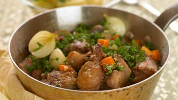 Kog op og skum af. Kom laurbær og timian ved. Læg låg på og lad det småsimre ved laveste varme i 3 timer, til kødet falder fra benene. Rens gule- og persillerødder og skær i mindre stykker. Pil løgene. Steg det hele i en pande for sig og drys med salt og peber.
