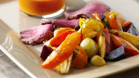 Oksemignon med rodfrugter og romersk pebersauce