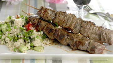 Riv skallen af citronen fint og pres den for saft. Overhæld couscous med kogende vand og lad den trække i 5 min. Sæt kødet på spid og pensl med lidt olie, spidskommen, salt og peber samt nogle dråber af citronen. Steg på grill (pande) i 3 min. på hver side. Vend couscous med alle grønsagerne, olivenolie, citronsaft og -skal og vend rundt. Server straks, spiddene er klar.