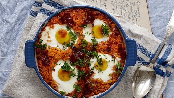 Sæt fadet i ovnen ca. 10-12 min. ved 200 grader, til æggene er stivnede.