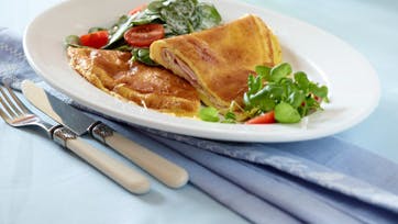 Pisk æggene med fløde, salt og peber. Varm en pande godt op og smelt smørret. Kom æggemassen på panden og lad den sætte sig. Skær skinken ud i lidt mindre stykker og læg den på, så den synker lidt ned i æggemassen, drys med revet ost. Når æggemassen er næsten fast, foldes den halvt over. Serveres med salat eller spinat vendt i lidt cremefraiche rørt med salt, peber og sennep. Pynt og anret med tomater i både, brøndkarse og brød.