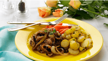 Kog kartoflerne møre i letsaltet vand og pil dem. Skær kartoflerne i 2 cm tykke skiver og vend dem i citronsaft og timian. Skær løgene i skiver og steg dem i smørret, til de er bløde og brune. Bland kødet med presset hvidløg, revet ost, salt og peber og form det til 3 hakkebøffer. Brun bøfferne på begge sider på en tør pande og læg dem i et ovnfast fad med løgene over. Steg bøfferne færdig ved 200° i 15 min., rist kartoffelskiverne i smørret, til de er gyldne, og server med dampede karotter.