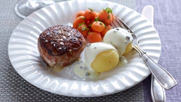 Form kødet til 4 flade bøffer og læg dem sammen to og to med en skive ost imellem. Tryk kanterne sammen og bind bacon omkring. Steg bøfferne ved jævn varme i 5 min. på hver side. Pisk flødeost og bouillon sammen og bring det i kog under omrøring. Tilsæt peberkornene og lad dem simre i 5 min. Smag til med salt og citronsaft og server med kogte kartofler og dampede gulerødder.