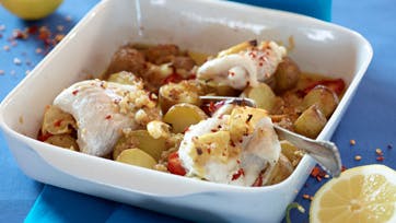 Halvér kartoflerne og hak løget, kom det i en bradepande og drys med olie, salt og peber. Sæt fadet i ovnen ved 200° i 15 min. Kom halverede tomater og lidt smørklatter ved. Giv det 10 min. mere. Blend imens ansjoser med persille, hvidløg og citronskal og juster konsistensen med lidt olie. Bland smuldret brødkrumme med lidt olie. Læg fisken oven på kartoffelbunden. Læg chiliskiver og citronskiver over og drys med brødkrumme. Giv det 12 min. i ovnen ved 200°. Servér med skefulde af den blendede ansjossovs. Spises med grøn salat.