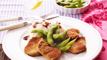 Nudler koges efter anvisning på pakken, og de serveres med schnitzlerne, sovsen og edamamebønnerne.