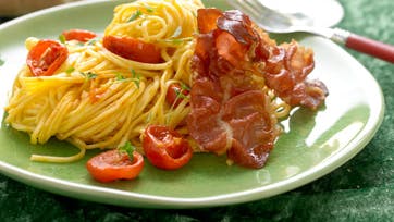 Halver tomaterne og spred dem ud på en bageplade. Drys med salt og timian og bag tomaterne i ovnen ved 175° varmluft i 30 min. Steg skinken sprød i olien ved middelhøj varme og lad den dryppe af på et stykke køkkenrulle. Kog pastaen i letsaltet vand i 3 min. og hak hvidløget fint. Sautér hvidløget i olien uden det tager farve, tilsæt pastaen sammen med tomaterne og evt. lidt af pastavandet. Server med strimler af skinke og friskkværnet peber.