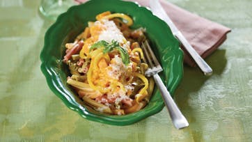Kog pastaen efter anvisningen på pakken. Skræl græskarret og skær det i små tern. Pil løgene og skær dem i skiver. Svits dem bløde i olie sammen med karry uden, at de tager farve. Tilsæt græskar og steg dem ved jævn varme 15-20 min., til de er bløde, og under jævnlig omrøring. Krydr med muskat, citronsaft, salt og peber. Server med afdryppet pasta, revet ost og grøn salat.