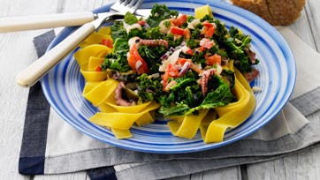 Pasta med grønkål og skaldyr