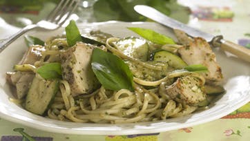 Kog pastaen efter anvisning på pakken til den er bidefast. Hæld vandet fra. Imens pastaen koger steger kyllingen i mindre stykker i lidt olie sammen med det ene fed hvidløg, salt og peber. Tag af panden og kom courgetter og det andet hvidløg i panden og steg i 1-2 minutter. Kom kylling, pesto og pasta i panden og vend rundt med de fleste af de hakkede basilikumblade og server drysset med frisk revet parmesan.