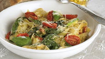 Kog pastaen efter anvisning på pakken. Sauter imens løg og hvidløg ved svag varme i smørret. Når pastaen er næsten klar, hældes vandet fra den (gem lidt vand). Lidt af vandet og ostene kommes i panden, til osten smelter. Der drysses med masser af peber og hakket basilikum og de ovnstegte tomater.