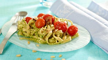 Blend spinaten med hvidløg, citronsaft, basilikumblade, parmesanen og 2/3 af pinjekernerne samt salt og peber. Tilsæt olien lidt efter lidt, mens der blendes, til pestoen har en jævn konsistens. Kog pastaen i letsaltet vand og lad den dryppe af i en sigte. Skyl tomaterne, skær hvidløgene i skiver og svits begge dele i olien et par min. Vend pastaen i tomaterne, tilsæt pestoen og server pastaen drysset med resten af pinjekernerne.