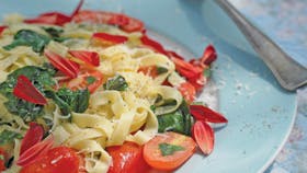Kog pastaen efter anvisningen på pakken, gem kogevandet. Skyl og halver tomaterne. Kom lidt smør i en stor pande og steg tomaterne ved svag varme. Kom basilikumbladene på panden og lad dem falde sammen. Kom den afdryppede pasta ved. Smag til med salt og peber og vend evt. lidt kogevand i. Anret med revet parmesan og et drys blomsterblade.