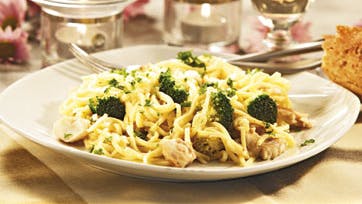 Skær broccolien i små buketter, torskefileten i mindre stykker og hak løgene. Svits løg og torskestykker let i smørret og krydr med salt og peber. Tilsæt broccoli, sennep og hvidvin og lad sovsen småsimre i 5 min. Kog pastaen i letsaltet vand. Rør den syrnede fløde i sovsen og vend pastaen i. Server pastaen drysset med persille og med et stykke godt brød.