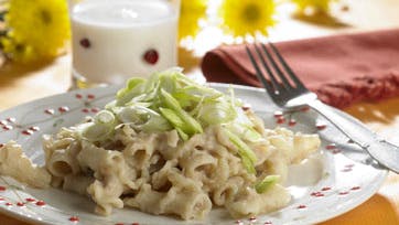 Kog pastaen al dente i letsaltet vand 8-10 min. og hæld vandet fra. Hæld væden fra tunfisken og lad den dryppe godt af. Hak løget og svits det let i olien. Tilsæt tunfisk, bouillon, mælk og hvidløg og lad det småkoge i 5 min. under låg. Blend sovsen, og jævn den med maizena rørt ud i lidt vand. Tilsæt citronsaften og kapers og smag til med peber. Vend pastaen i tunsovsen, og server den drysset med forårsløg eller porre.
