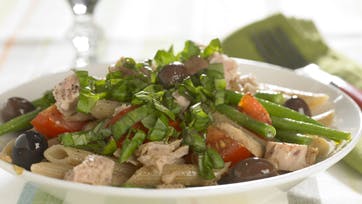 Kog pastaen efter posens anvisning, kog bønnerne med de sidste 4 min. Hældes i en sigte og holdes varmt i gryden. Pil og hak løg og hvidløg. Svits det i olien fra tunfisken. Tilsæt tunfisk, oliven, halverede tomater, citronskal og saft. Bland forsigtigt, det er godt med lidt større stykker tunfisk. Vend pasta, bønner og snittet basilikum i og smag til med salt og peber.