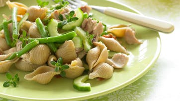Kog pastaen i letsaltet vand og lad den afkøle og afdryppe. Blancher de grønne bønner og halvér dem. Flæk agurken på langs, fjern kernerne med en teske og skær agurken i tynde skiver.