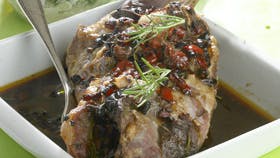 Udben lammet som beskrevet. Skær peberfrugterne i små tern. Steg dem ved hård varme, så de får let brun farve i kanterne. Tag af panden og skru ned. Steg løg, hvidløg og timian, til løgene bliver klare. Vend peberfrugterne i og smag til med salt og peber. Fyld dette i lammet og luk med snor. Steges i ovnen, drysset med salt og peber i 1½ time ved 180° - til sidst kan skrues op for at give brun stegeflade. Mens stegen er i ovnen, skæres courgetten i lange, skrå stykker, der grillsteges på pande med salt og peber. Vendes afkølet i en dressing af rygeost, cremefraiche, hakket purløg og plukket kørvel. Serveres med rødvin og flute.