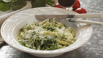 Steg løg og hvidløg blidt i olie og smør. Blend bouillon og spinat til en grøn masse. Rør det sammen med løgene. Kog pastaen i 9 min. og tilsæt broccolien de sidste 2 minutter. Rør ostene og den drænede pasta med broccoli i spinatsovsen og server rygende varm.