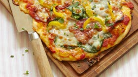 Rør gæren ud i vandet og tilsæt salt og olie. Rør melet i, ælt dejen smidig og lad den hæve under et klæde i 1 time. Del dejen til din pizza i to og rul hver del ud i 0,5 cm's tykkelse. Kom tomatsovs på dejen og derefter spinat, skinke, chorizopølse i skiver og peberfrugt i strimler. Riv mozzarellaen i stimler og fordel den over din pizza. Krydr med salt og peber og bag din pizzaer ved 250° i 15 min. Servér med en god salat til.