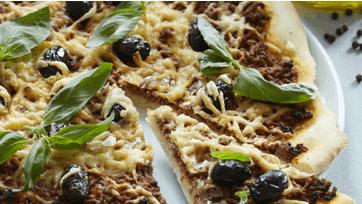 Lav dejen og tomatsovsen. Steg kødet i olien, kom tomatsovsen ved, når kødet er brunt, og lad det simre i 5 min. Rul dejen til 2 eller 3 pizzaer. Smør kødsovsen på, fordel oliven over og drys med revet ost. Bag pizzaerne i en 220º varm ovn i ca. 15 min. Pynt med basilikum og servér med en grøn salat.