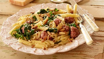 Kog pastaen efter anvisningen på pakken. Skær pølserne i små stykker og steg dem i olie i en stor pande eller gryde. Du kan også trykke farsen ud af pølserne og stege dem som små kødboller på panden. Rør spinaten i, når pølser/kødboller er næsten stegte. Rør den kogte pasta i gryden og drys med pinjekerner og revet ost. Server med salat.