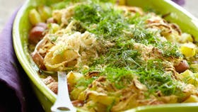 Skær kartoflerne i tern, kålen i strimler og pølserne i skiver. Hak forårsløgene og kom dem i et ovnfast fad sammen med kartofler og pølser. Skær løget i skiver og kog dem i vandet tilsat smør og eddike i et par min. Tilsæt salt, peber, sennepspulver og fløde og hæld sovsen over pølser og kartoflerne. Drys med rasp og stil fadet i ovnen ved 200° i 45 min. Servér med masser af friskhakket dild.