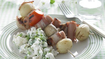 Skær pølserne i 2 cm lange stykker, skær peberfrugterne i mindre stykker og rens champignonerne. Sæt skiftevis pølser, peberfrugt, champignoner og kartofler på spid sammen med baconskiverne. Del blomkålen i små buketter, bælg ærterne og hak forårsløgene. Bland fløden med presset hvidløg og persille, smag til med salt og peber og vend blomkål, ærter og forårsløg i. Grill spiddene et par min. på hver side og server med blomkålssalaten.