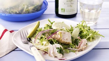 Kom persillestilke, peberkorn og løg i både i vand i en gryde og bring i kog. Kom kyllingestykkerne i og skru ned, så vandet står og skælver. Lad det pochere i 10 min. Sluk så og lad det trække i vandet i 30 min. Bland fintskåret fennikel med kapers, rødløg, persille, mayonnaise og lidt af citronsaften i en skål. Skyl salat og brøndkarse og kom det i en god beholder. Kom både af avocado over og skær kyllingen i store skiver, der toppes med fennikelsalaten. Spises med brød.