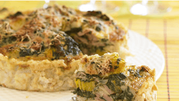 Kog risen i 4 dl vand i 20 min. Gør imens fyldet klart. Steg porrerne i olie på en stor pande i 5 min. ved middelvarme. Kom spinat og persille ved og lad det falde sammen. Dræn godt. Rør med æg, mælk, krydderier, skinke og ost. Rør risen med ægget og lidt salt og pres den klistrede masse ud i en smurt eller foret springform, så den danner kant som en tærte. Bag den ca. 10 min. ved 200° med kant af alufolie, så risdejen danner en skorpe. Kom fyldet i og bag videre i ca. 1 time ved 180°, til fyldet er helt fast. Lad den lige sætte sig, før den skæres.