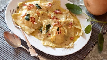 Bland de to slags mel og saml dejen med æg og blomme. Den skal være tør og langsomt samles. Læg dejen koldt. Skræl græskar og skær kødet i mindre stykker, kog dem møre ca. 15 min. Purér og kør det igennem en sigte. Rør ricottaen og bacon i og kom det i en sprøjtepose. Rul dejen ud og udstik cirkler. Sæt fyldet på i små toppe, pensl kanterne med æggeblomme og fold til halvmåner. Kog halvmånerne i rigeligt letsaltet vand i ca. 2-3 min. Hæld vandet fra, men gem lidt til sovs. Smelt smørret i en pande og kom fintskårne salvieblade og finthakket bacon i. Hæld pastaen på og jævn med kogevandet. Vend med friskrevet parmesan og server straks.