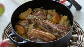 Skær kødet i skiver efter hvert ben. Gnid skiverne med salt og peber og brun dem i en stegegryde i olien. Pil løgene og skær dem i både. Skær æblerne i både med skræl. Kom løg, æbler, hvidkål, timian og kommen i gryden og hæld æblemost ved. Lad det simre mørt på ca. 1 time ved svag varme under låg. Smag til med salt og peber. Spis revelsbenene direkte fra gryden med sennep og rugbrød.
