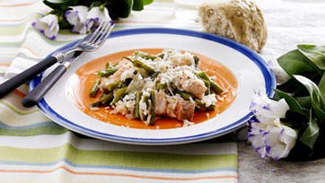 Nip bønnerne og skær dem i mindre stykker. Sauter løg og ris i olien, uden at de tager farve. Tilsæt hvidvin og lad risen opsuge væden, mens der røres. Skær laksen i tern, vend dem og bønnerne i risene og tilsæt bouillonen lidt ad gangen, til det hele er brugt. Smag til med salt og peber, drys parmesanen over og server med et godt stykke brød.