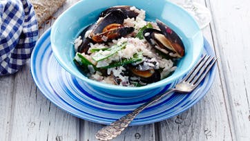 Sautér løgene i smørret, tilsæt ris og steg dem i smørret til de er blanke. Tilsæt hvidvinen og lad risene absorbere vinen. Tilsæt hønsebouillonen lidt ad gangen, så risene næsten når at optage væden, før der tilsættes yderligere væde. Snit ærterne i 2 cm store stykker og tilsæt dem sammen med muslingerne og den sidste dl bouillon. Vend parmesanen i, når det sidste væde er forsvundet, retten skal være cremet. Servér retten med groft brød og et drys af friskkværnet peber.