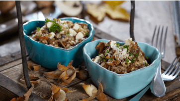 Rens svampene og skær dem i mundrette stykker. Sautér løg, svampe og ris i olien, uden de tager farve. Tilsæt hvidvin og lad risene opsuge væden. Tilsæt bouillonen lidt ad gangen, til det hele er brugt. Vend parmesanen i, smag til med salt og peber og servér.