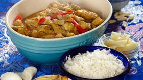 Der findes mange variationer af ristaffel, og det består altid af mindst en varm ret med svinekød i karry og ved siden af gerne lidt krydret kylling.