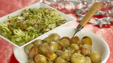 Rosenkålen snittes meget fint. Skalotteløg og kål lynsteges i smeltet smør og krydres med salt, rosa peber og godt med friskrevet muskatnød. Serveres til, evt. drysset med lidt rosa peberkorn.