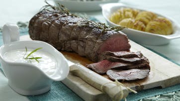 Brun din roastbeef i smørret sammen med rosmarin og lad den stege færdig i ovnen sammen med kartoflerne i 30 min. Rør fløden med bearnaiseessens, estragon og smag til med salt og peber. Server din roastbeef med en god bønnesalat.