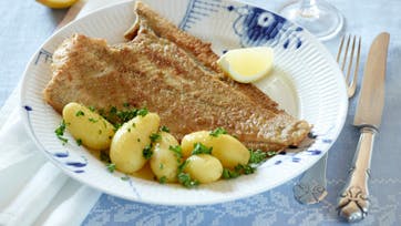 Kog kartoflerne i letsaltet vand. Hæld koldt vand på og pil dem. Vend de rensede, flåede rødspætter i rugmel blandet med salt og peber. Steg dem i smør på en pande, der skal ikke spares på smørret, men der optages heller ikke mere end det, der er brug for. Stegetiden er ca. 6-8 min. på hver side. Smelt smørret til sovsen uden, at det bruner. Hak skyllet persille og vend i sovsen. Server fisken med pillede kartofler, smørsovs, citronbåde og en salat af hovedsalat med dressing af fløde, citron, sukker, salt og peber.