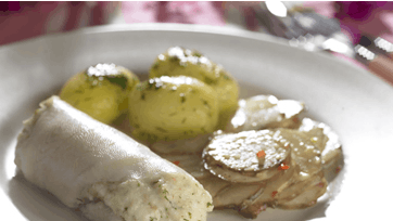 Vask jordskokkerne godt, skær dem i tynde skiver og læg dem i vand med citronsaft. Rør en marinade af olivenolie, dijonsennep, sirup, hvidløg, chili, salt og peber. Hæld vandet fra jordskokkerne og vend dem i dressingen. Tag de 4 største fileter fra og hak resten fint med dild og rejer. Rør æggeblomme og fløde i den hakkede fisk og fordel farsen på de 4 hele fileter. Rul fileterne om farsen og damp dem i 7 min. Server med citron og kogte kartofler vendt i dildsmør.